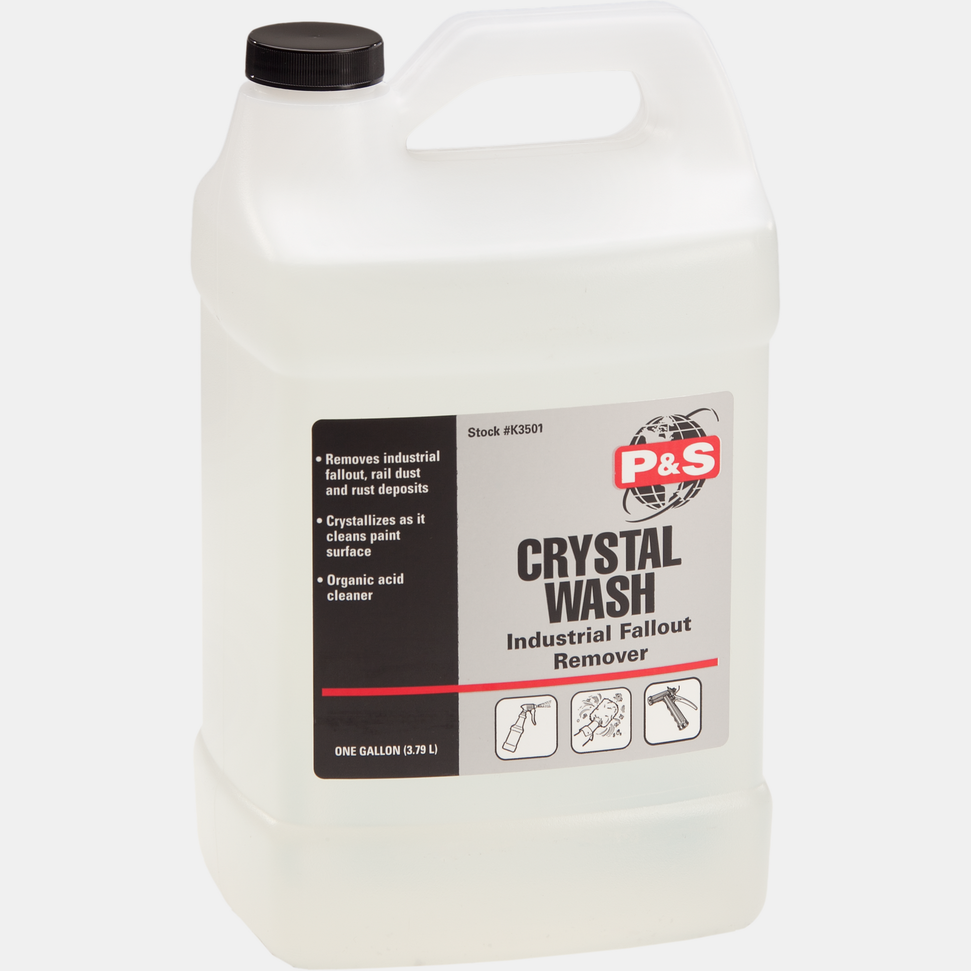 A general strength, industrial fallout remover designed for safe and easy, application and removal. Crystal Wash crystallizes as it dries, physically and chemically breaking free fallout particles. Crystal Wash removes industrial fallout, rust deposits and pollution particles. (Gals.- 4 per case, 5's, 32's, 55's)