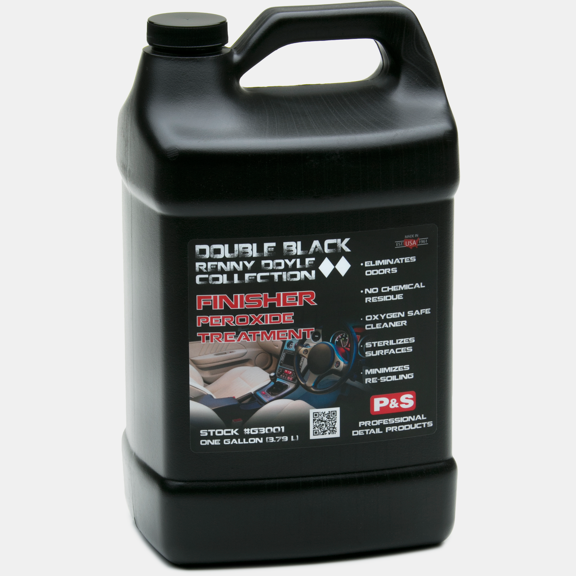 Finisher Peroxide Treatment is Step #3 in the Double Black Interior Cleaning System. Finisher completes the system by adding a final attack on odor causing molecules and organic stains. Finisher breaks down odor causing chemicals, eliminates any residual organic stains and slightly sterilizes the surface. Finisher assists in reducing water stains, mold and mildew odors as well as finalized stain removal. Finisher breaks down into oxygen and water, leaving no chemical residue left that requires further removal. (16 oz.- 12 per case, Gals. 4 per case)
