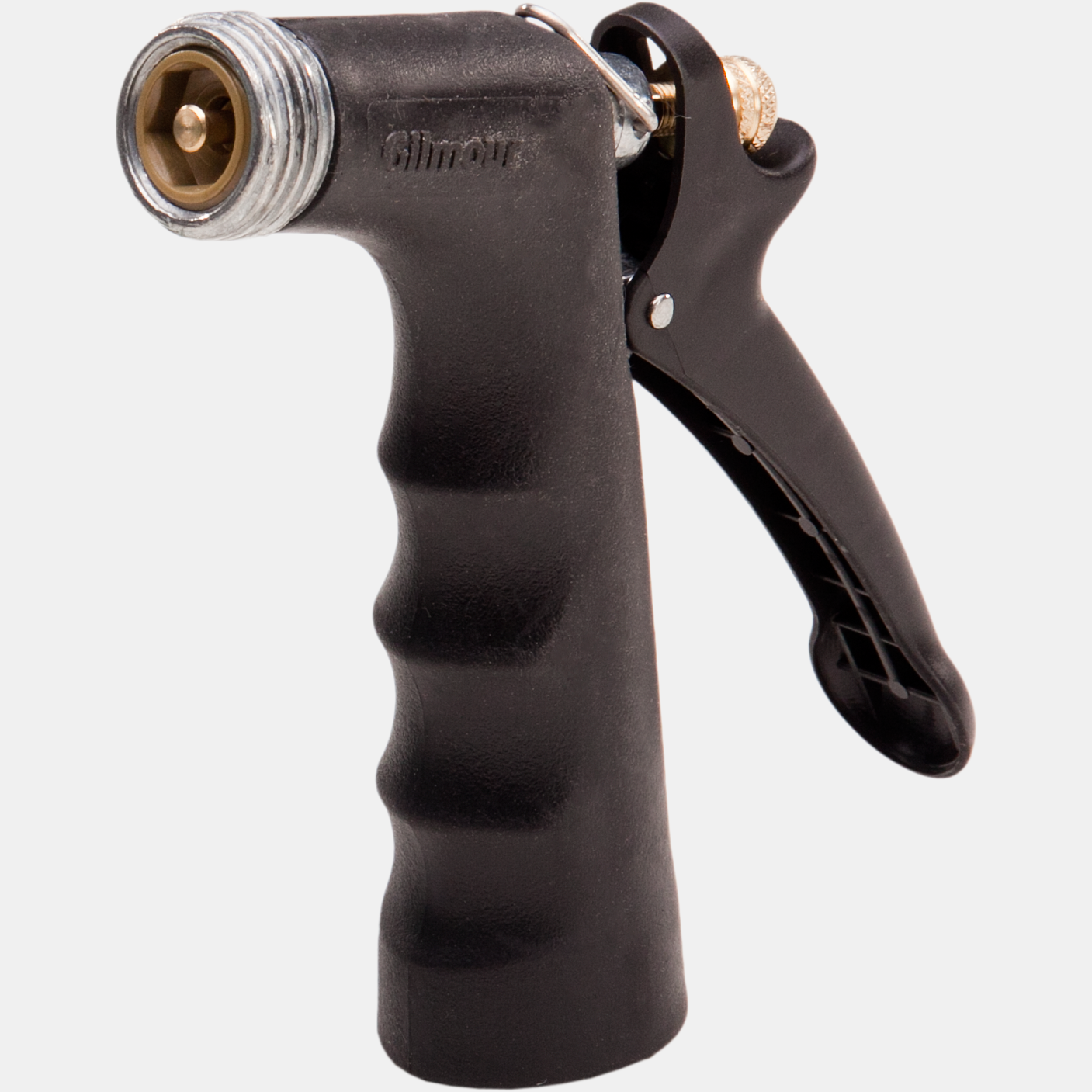 This water spray nozzle has a comfort grip consisting of a black vinyl cushion. Like most water spray nozzles, this hose gun is a full flow nozzle. It has a threaded front which is used to attach watering accessories. Features and Benefits: Brass valve, adjustment nut, and stainless steel spring, has a leak-proof seal.