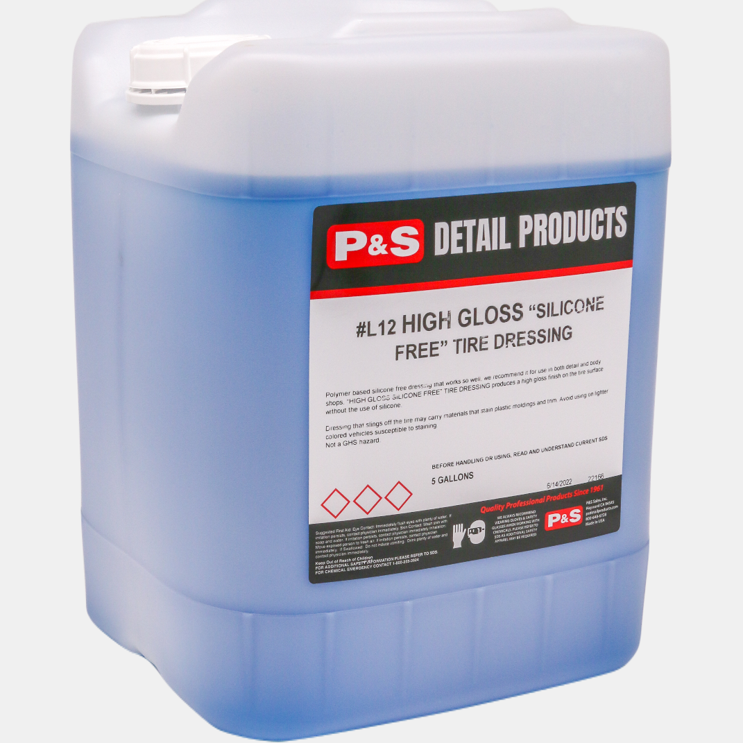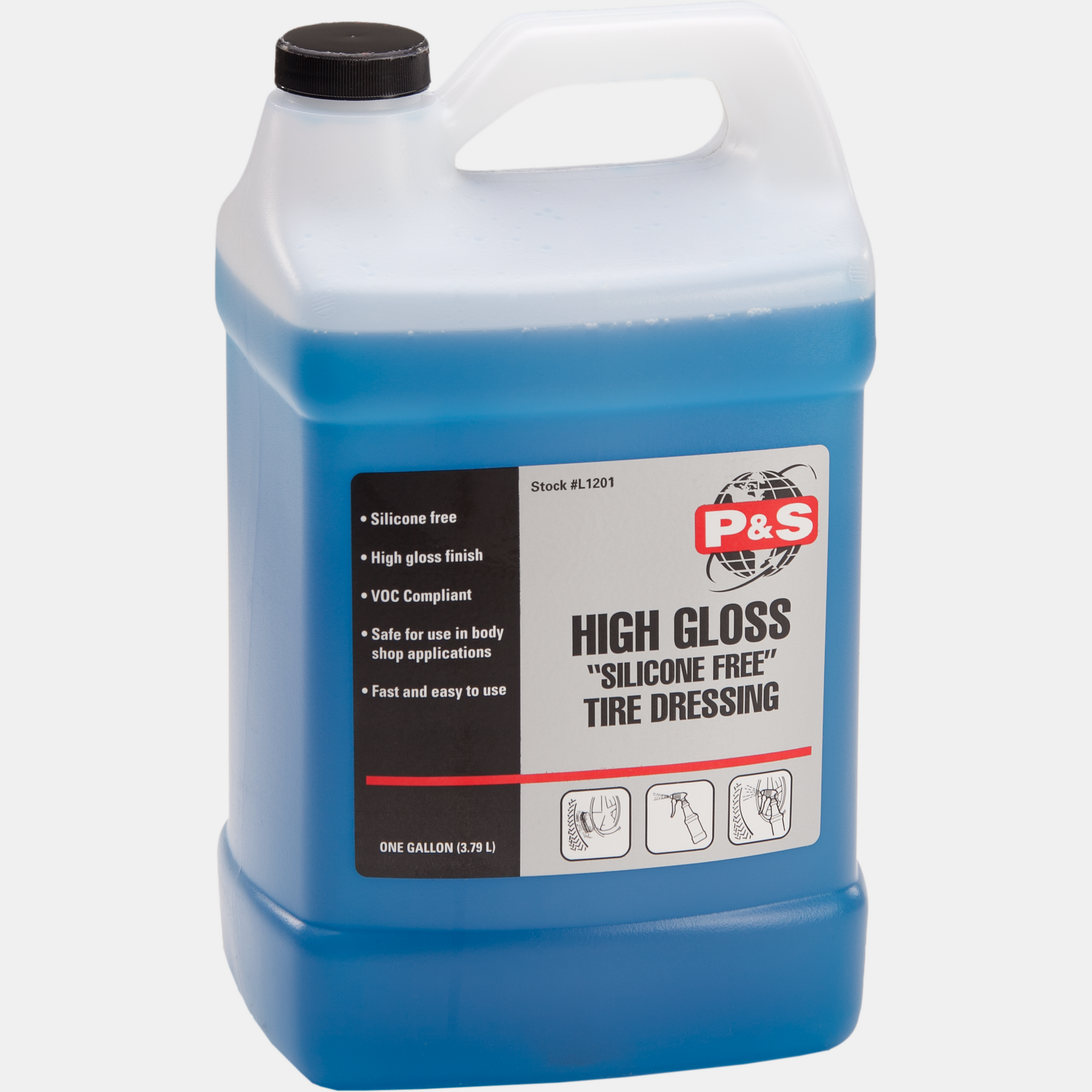 A water based dressing recommended for use in both detail and body shops. HIGH GLOSS SILICONE FREE TIRE DRESSING produces a high gloss finish on the tire surface without the use of silicone. This product produces such a high gloss finish it may be confused with a standard silicone based dressing.